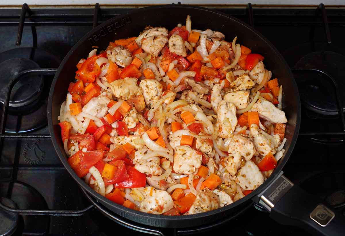 Готовить удобно сразу на двух сковородках, одна из них должна быть с высокими бортиками. Наливаем в каждую из двух сковородок немного растительного масла. В сковородку с высокими бортами выкладываем овощи и обжариваем их до мягкости. На другой сковородке обжариваем курицу до появления легкой поджаристой корочки.