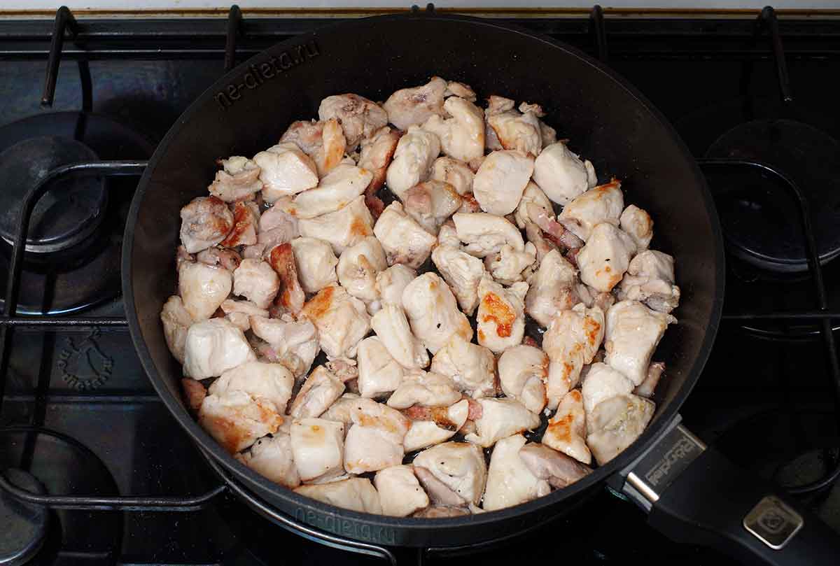 - В сковородке разогреем растительное масло. Быстро обжарим на нем кусочки курицы.
