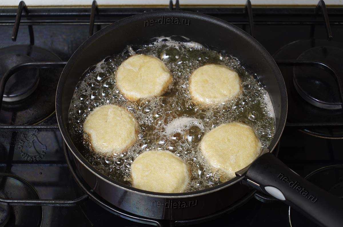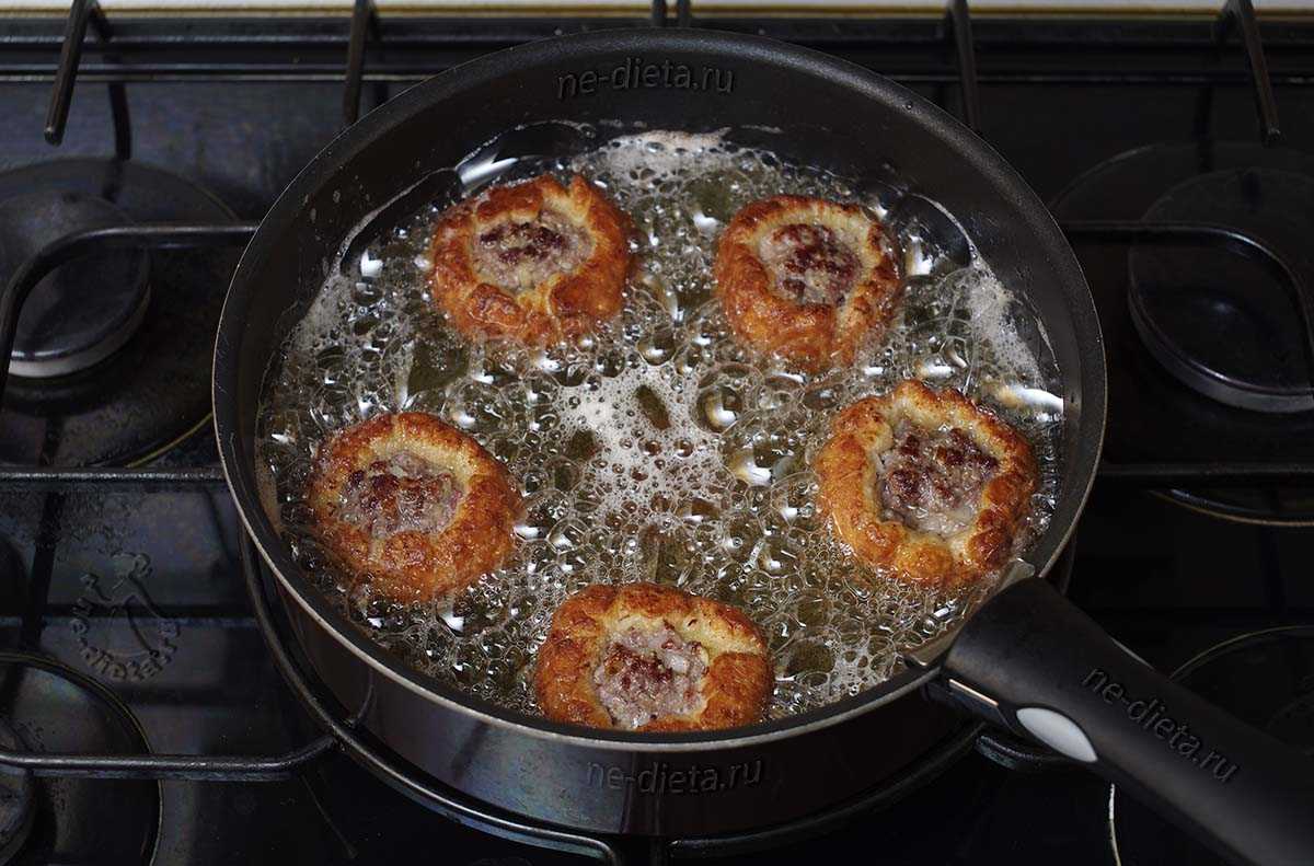 Важно!Не стоит готовить все десять пирожков одновременно, чтобы не понижать температуру растительного масла и не создавать толкучку на сковородке. Эти пирожки лучше обжаривать во фритюре в 2 — 3 приема по несколько штук.