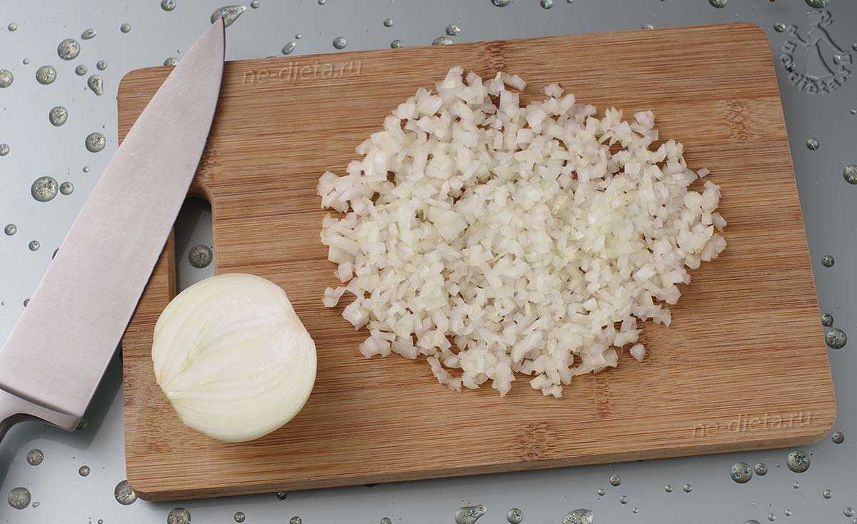 Лук нарежьте мелкими кубиками, присолите и помните руками, чтобы овощ пустил сок.