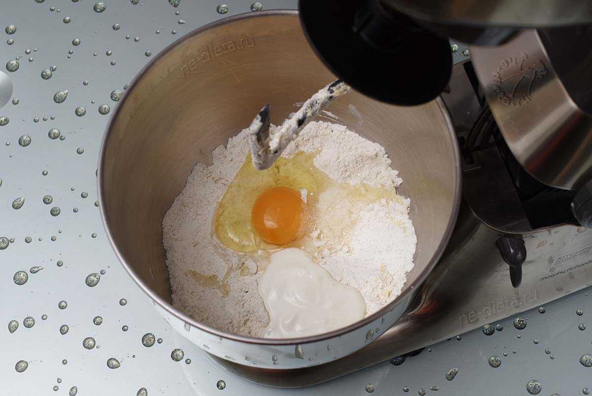 Положить сметану и яйцо и замесить тесто руками или в кухонном комбайне с помощью насадки «крюк».