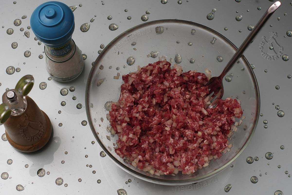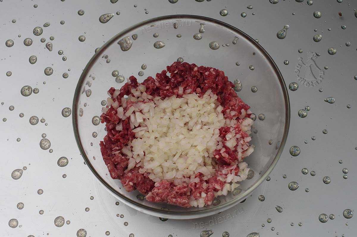 В миске смешать мясной фарш, измельченный репчатый лук и 3 ст. л. воды, которая придаст начинке особую сочность.