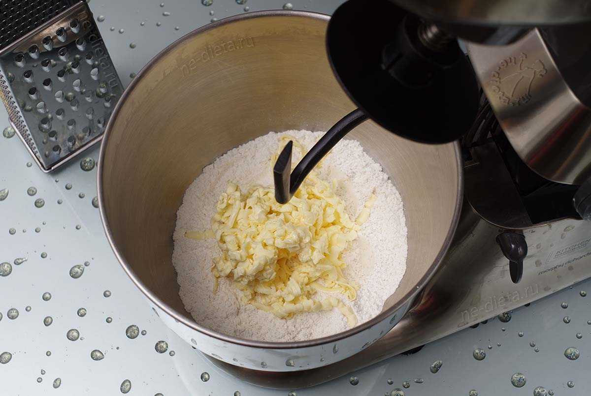 К муке добавить холодное сливочное масло, натертое на крупной терке, и быстро перетереть тесто руками до состояния крупной крошки.