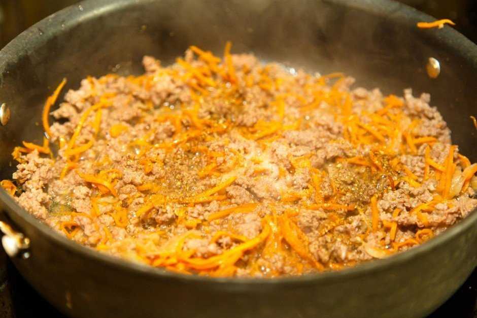 Фарш жарить с морковью, постоянно помешивая его, разбивая лопаткой, чтобы не образовывались крупные кусочки.