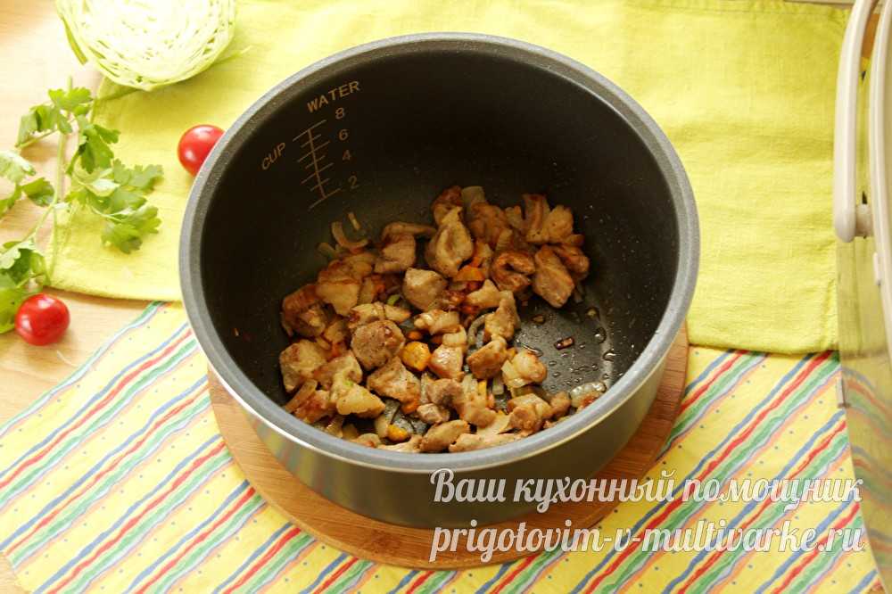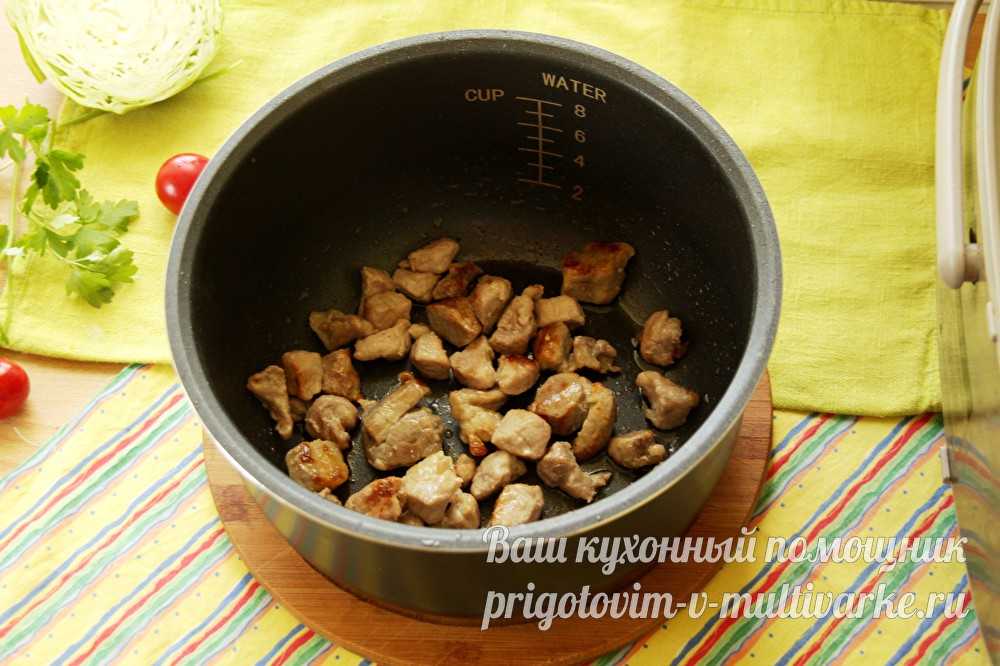 - Добавляем мясо, нарезанное кубиками, и изменяем режим на «жарка» (свинина подрумяниться за 10 минут);
