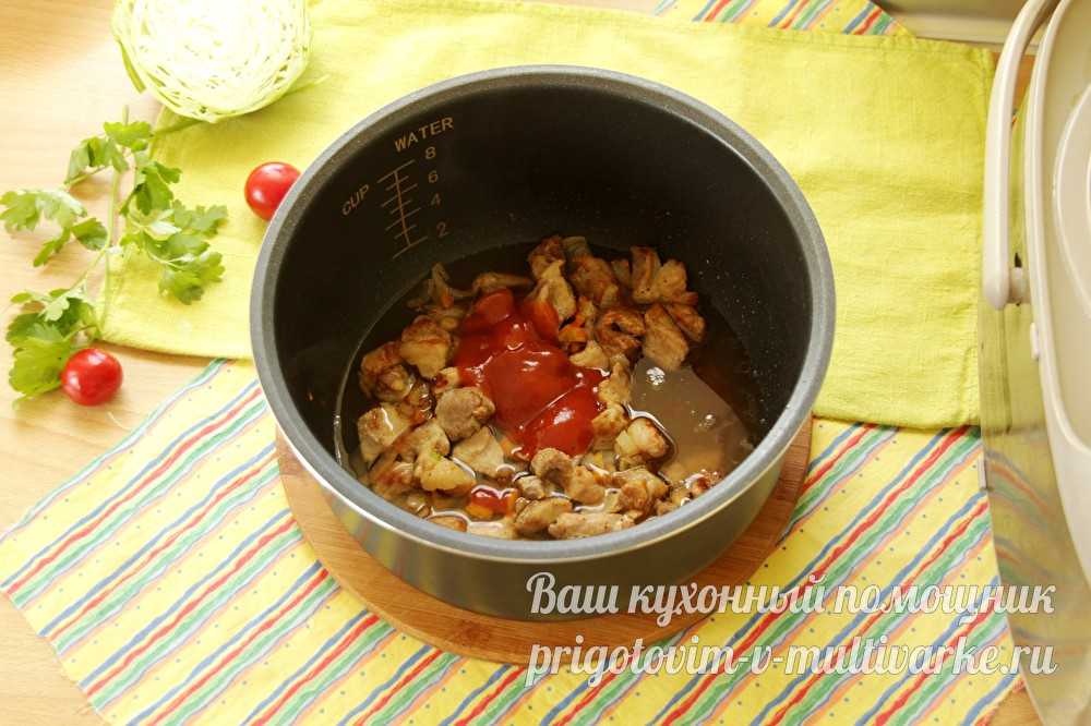 - Затем следует положить томатный соус, перемешать массу, добавить капусту, нашинкованную соломкой, потом влить еще немного рассола и готовить еще 5 мин. под крышкой.