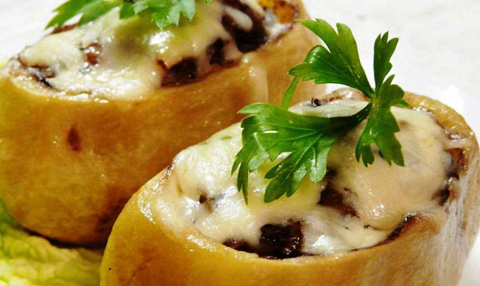 - В готовых картофельных клубнях вырезать углубление, наполнить грибной массой. Обсыпать натертым сыром.