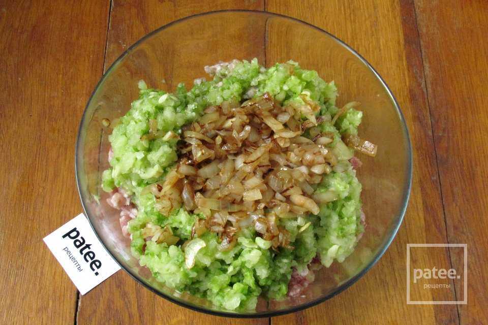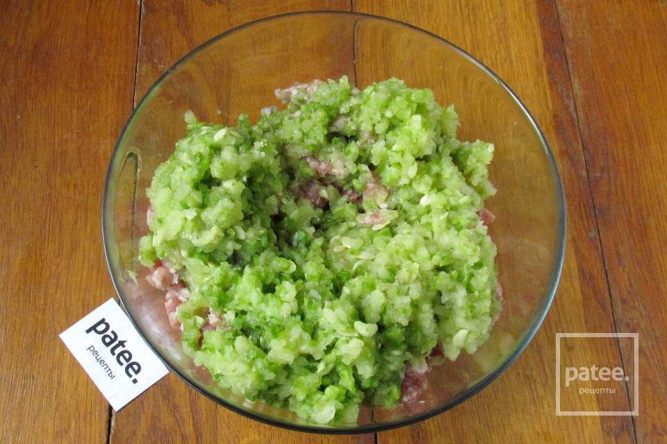 Кабачок также пропускаем через мясорубку с самой крупной решёткой и добавляем получившуюся кабачковую массу в свиной фарш.