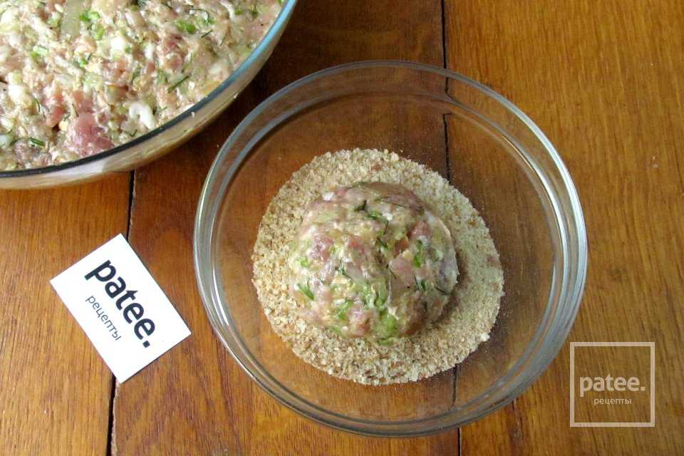 Смоченными в воде руками формируем из фарша круглые котлеты и панируем их в сухарях.