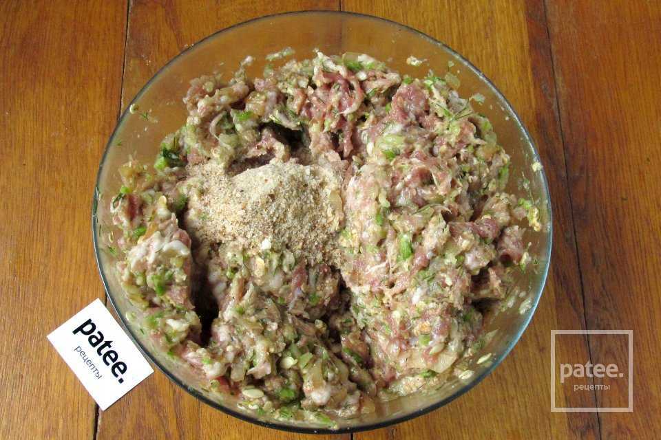 Фарш тщательным образом перемешиваем. Если фарш для котлет получается слишком жидким, водянистым из-за сочности кабачка, всыпаем в него немного панировочных сухарей — они впитают лишнюю жидкость, исполнят роль загустителя.