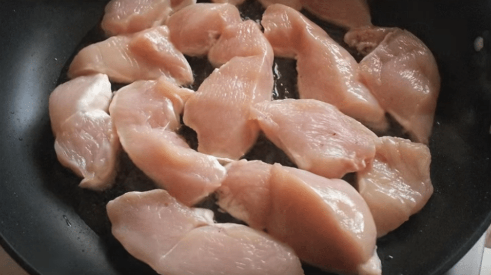 1. Куриное филе разрезаем тонкими и длинными пластинами и обжариваем на сковороде с растительным маслом на среднем огне до золотистой корочки с обеих сторон.
