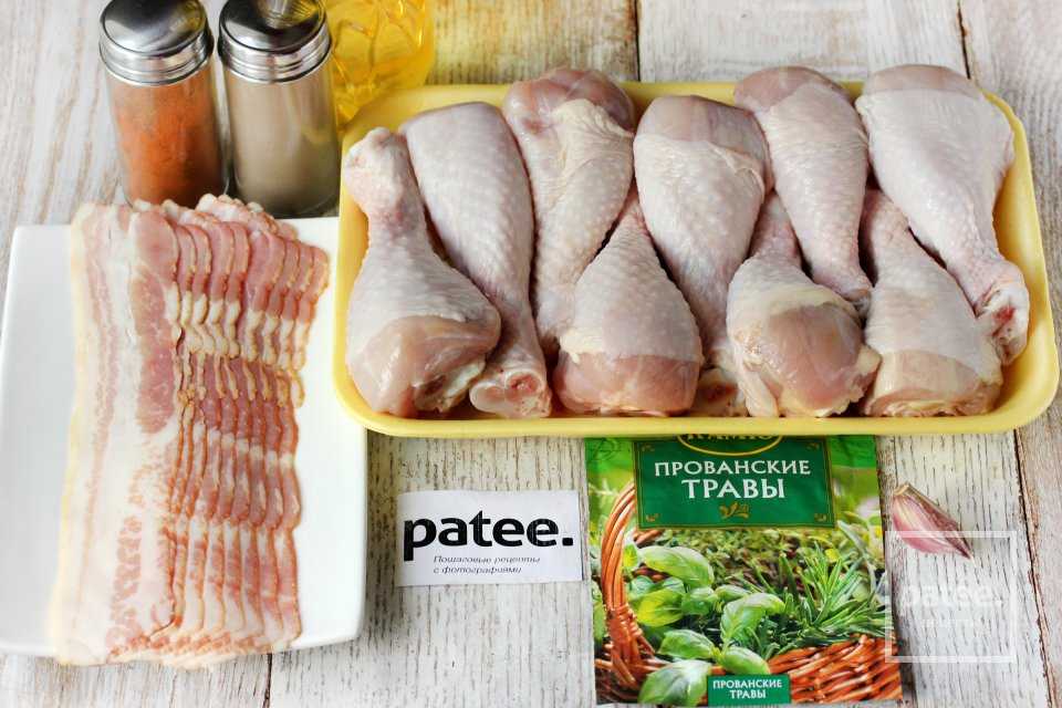 Для приготовления куриных голеней в беконе в духовке понадобятся следующие продукты. Бекон должен быть сырокопченым, не вареным. Можно бекон заменить на прошутто.