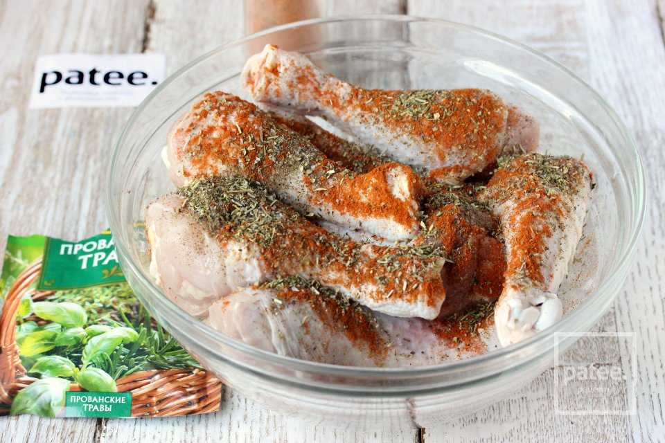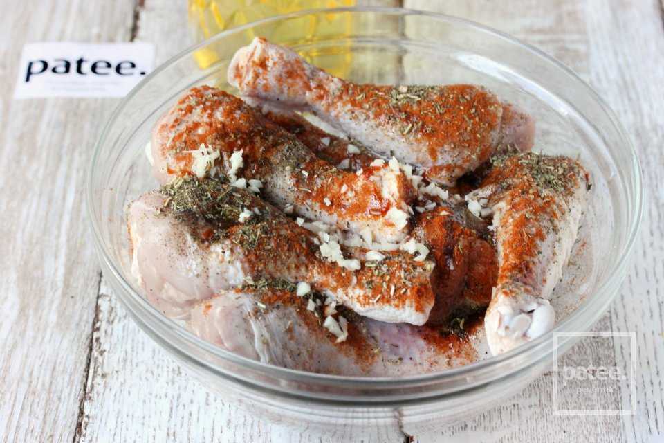 8 куриных ножек, 2 чайные ложки приправы для курицы, 1 столовая ложка оливкового масла