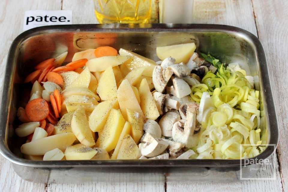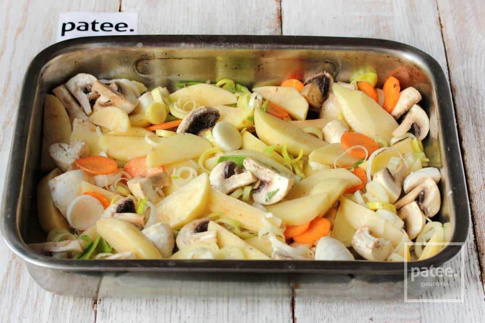 Выкладываем голени в беконе в смазанную растительным маслом форму для запекания.