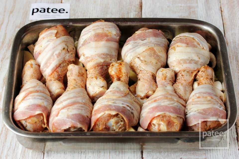 Обернем каждую голень полосками бекона. Если бекон нарезан толстыми полосками и его не получается хорошо завернуть, используйте для закрепления бекона зубочистки или деревянные шпажки.