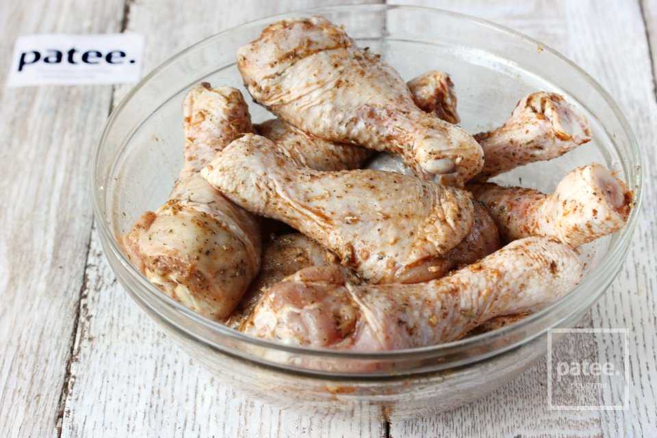 - Голени замаринуйте специями, посолите и приготовьте жареные куриные ножки на сковороде. Рецепт готовится с запеканием в духовке.