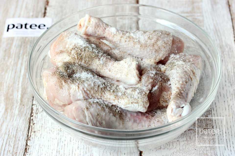Куриные голени обсушим бумажным полотенцем и посыплем солью и перцем по вкусу со всех сторон.