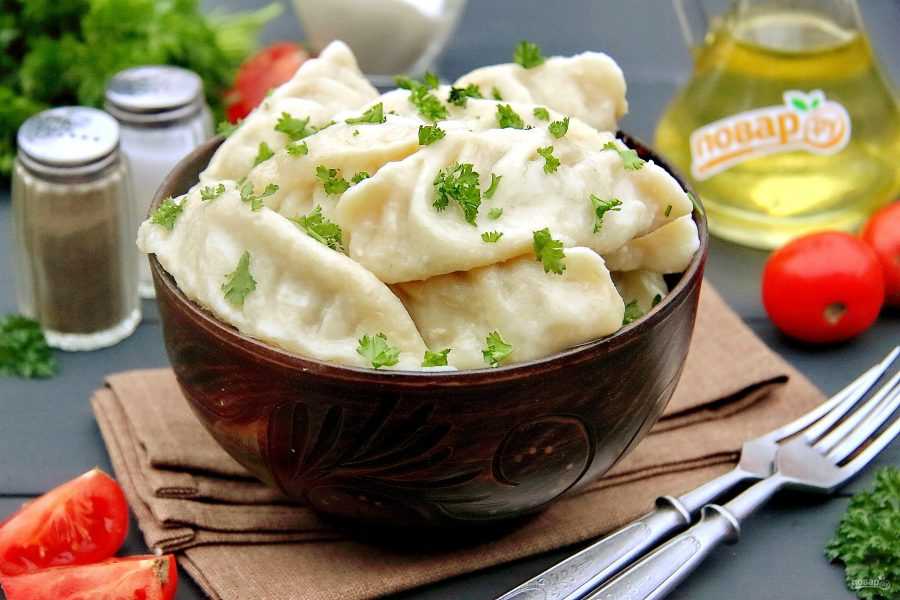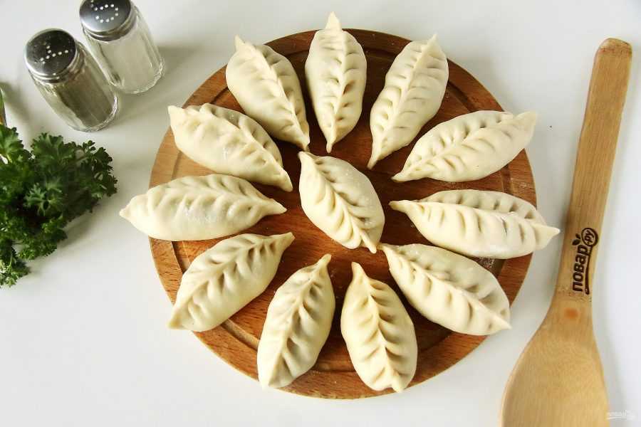 Тесто. Мука, вода, соль, растительное масло, можно добавить одно яйцо. Раскатываем пласт толщиной миллиметра 2−3, вырезаем кружочки, примерно диаметром 7−8 см. На каждый кружок накладываем чайную ложку начинки, берём в левую руку изделие (как вареник), а правой защипываем косичкой: начинаем справа, скрепляем пальцами кончик обеих сторон, затем попеременно, чуть сгибая и захватывая стороны изделия, прикрепляем их друг к другу, всё время двигаясь влево. Можно помогать указательным пальцем левой руки, придерживая им фарш внутри изделия.
