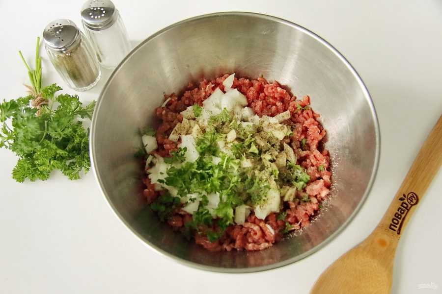- Смешиваем сырое мясо, лук, зелень, чеснок и добавляем зажарку и сметану.