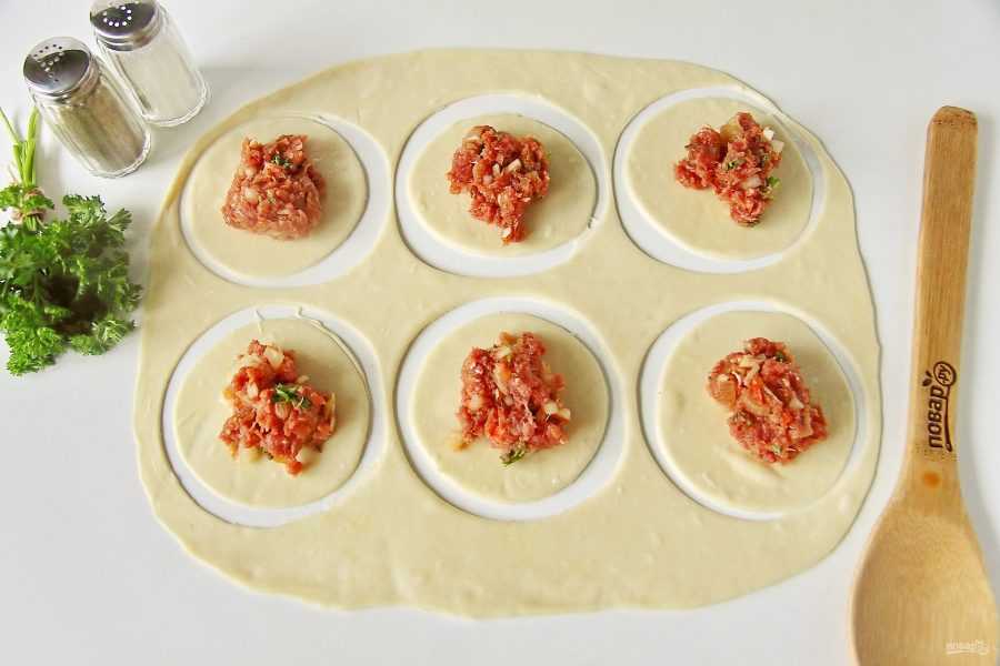 - На каждый кружочек из теста выкладываем мясо и склеиваем края в форме косички, как показано в видео с портала You Tube.