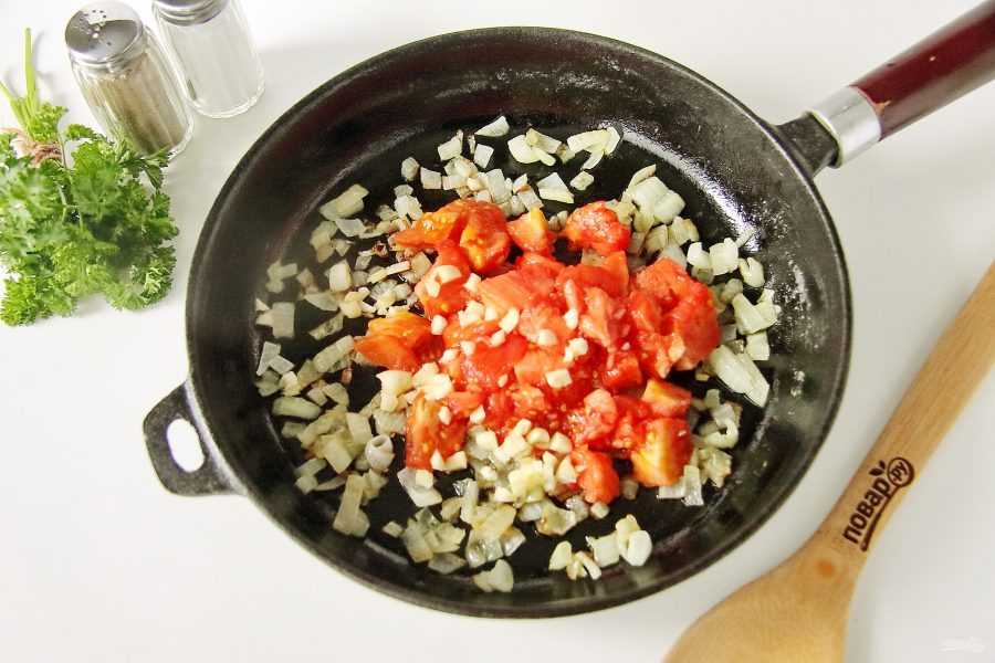 Добавьте нарезанные кубиками помидоры, предварительно ошпарив их и сняв шкурку, и нарезанный мелко чеснок.