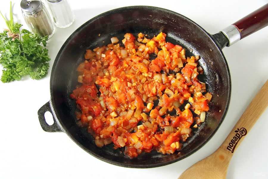 - На сковороду добавляем томатную пасту, разведенную водой до густоты сметаны, либо свежие мелко нарезанные помидоры.