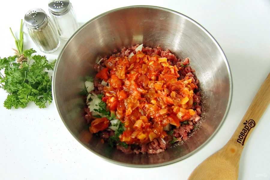 В фарш добавьте соль и специи, нарубленную зелень, и одну луковицу, нарезанную мелким кубиком. Вторую луковицу нарежьте так же, разогрейте сковороду со смесью сливочного и подсолнечного масел, и обжаривайте лук до мягкости. В это время помидоры очистите от кожуры и нарежьте кубиками, затем добавьте к луку. Тушите минут 7, помешивая.