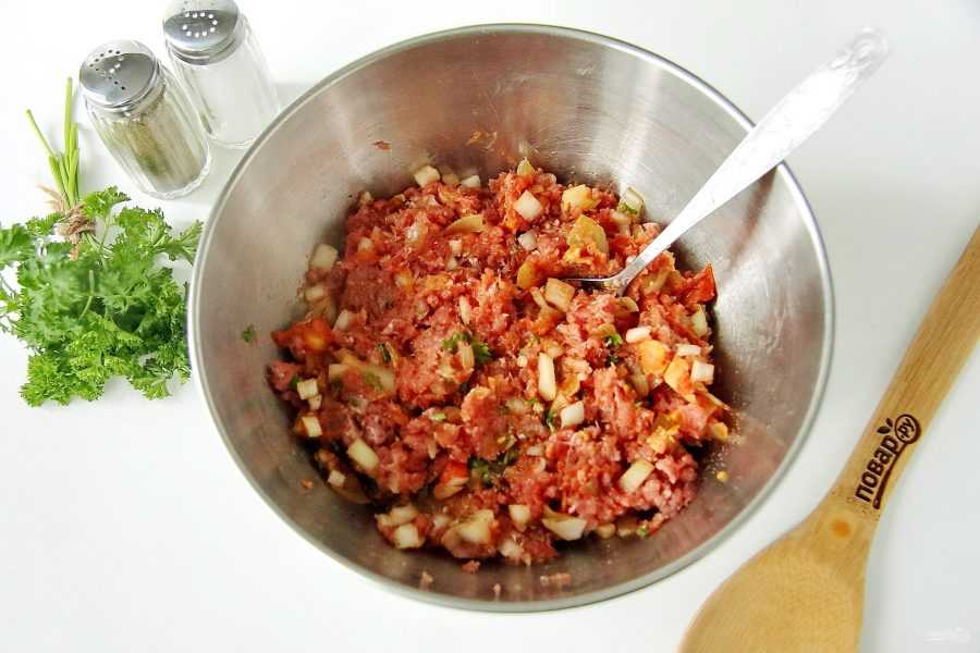 - К перемолотой с помощью мясорубки баранине добавляют натёртый или мелко нарезанный репчатый лук (2–3 головки). При желании его можно предварительно обжарить.