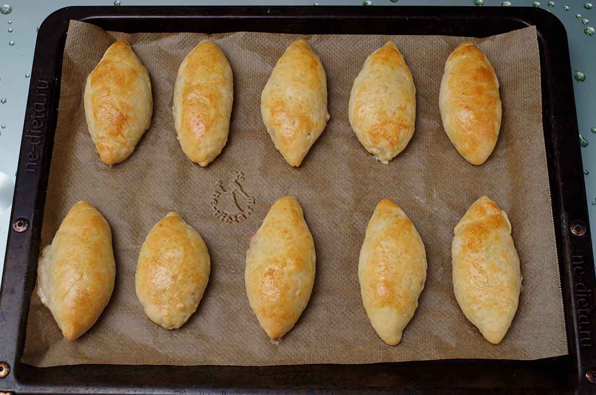 10. Выпекать пирожки на верхнем уровне духовки в течение 15 – 17 минут до появления сверху аппетитной румяной корочки. Из указанного количества ингредиентов у меня получилось всего 20 пирожков среднего размера, испеченных на двух больших противнях.