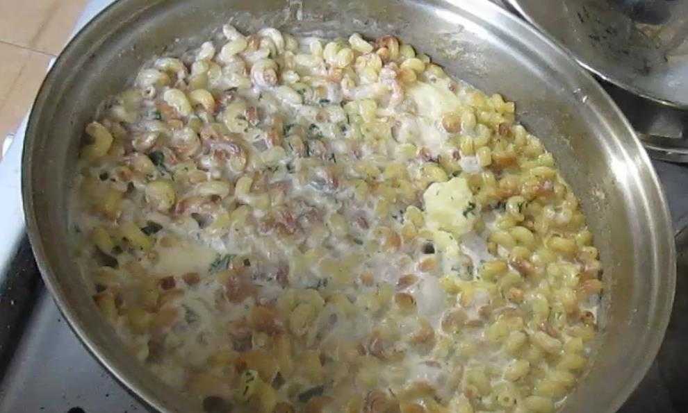 Мелкие макаронные изделия можно предварительно не отваривать, а сразу приготовить в сковороде. Для этого необходимо добавить немного чистой питьевой воды. Она впитается в пасту и не испортит структуру соуса. Вместо сосисок можно использовать любой вид колбасы. Такое блюдо станет полноценным приемом пищи. Его можно быстро приготовить даже на завтрак.