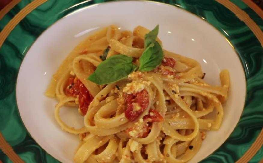 Это интересное блюдо гуляет по просторам всемирной паутины. Каждый человек, который рискнул его приготовить, остался доволен оригинальным насыщенным вкусом. Сочетание творожного сыра с помидорами черри и базиликом превратит фетучини в классическую итальянскую пасту.