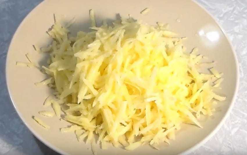 5. Соедините мясо, рубленый лук и натертый картофель, поперчите, немного посолите. Можете добавить любимые специи.