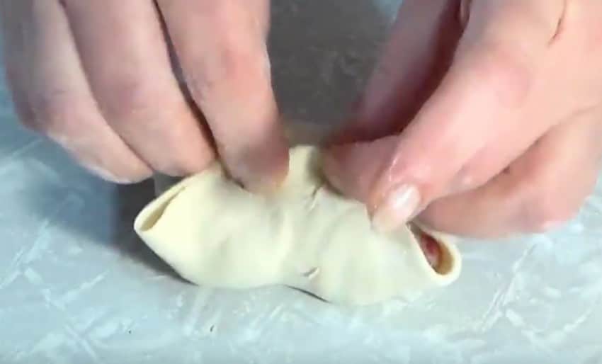 Согнуть заготовку пополам и прищипнуть тесто, как показано на картинке ниже. При этом останутся открытыми три пространства – в центре и по краям. Тесто слипается без проблем и будет крепко держаться.