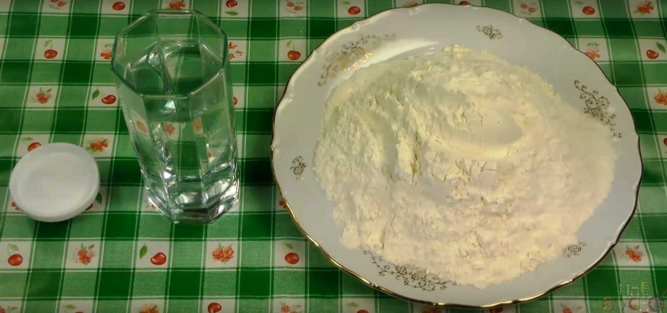 Воду заранее остудите в холодильнике, можно даже поставить ее ненадолго в морозильную камеру. Муку пропустите через сито.