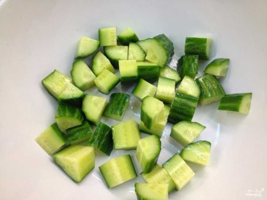 - Свежие огурцы нарезать кубиками. Если огурцы крупные и кожица грубая, то надо ее предварительно срезать.