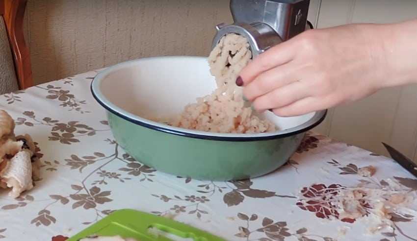 - Теперь пропустить через мясорубку обработанную курицу. Смешать фарш с крошкой из отрубного хлеба, солью, рубленой петрушкой и сметаной.