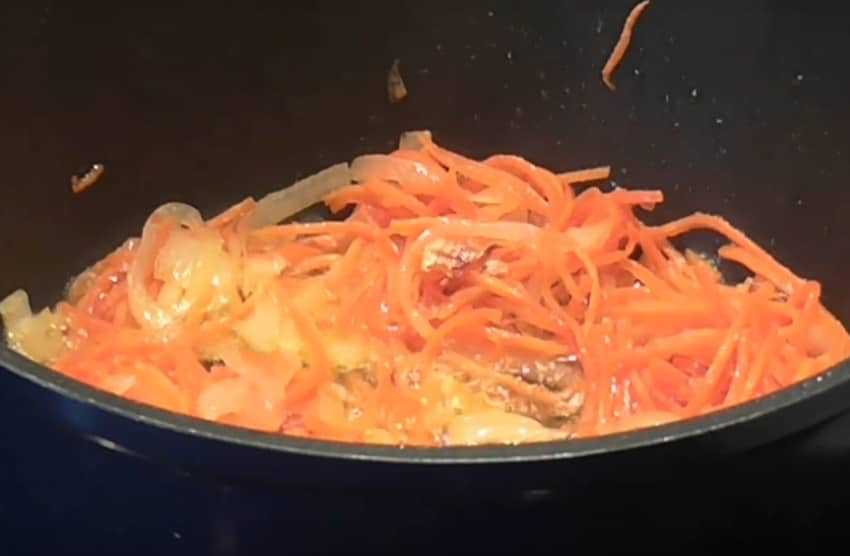 - Далее добавляем натертую морковь. Пассеруем ее вместе с луком в течение пяти минут.