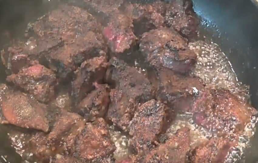 - Перекладывается в сковороду печень и тушится 5-6 минут до появления румяной корочки.