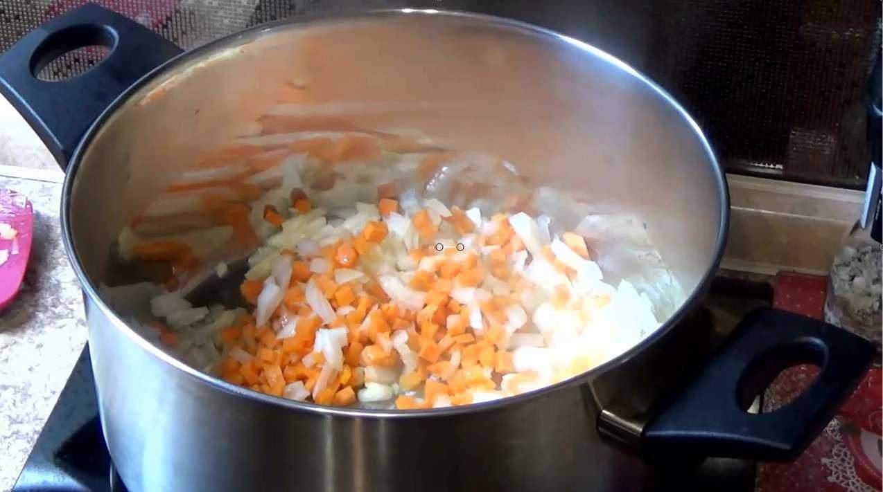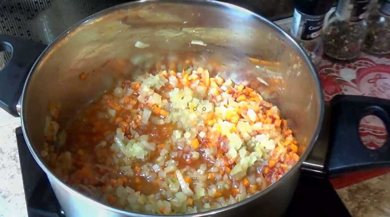 Начните с варки бульона с мясом и перловкой. Положите в кастрюлю овощи и дайте им обжариться.