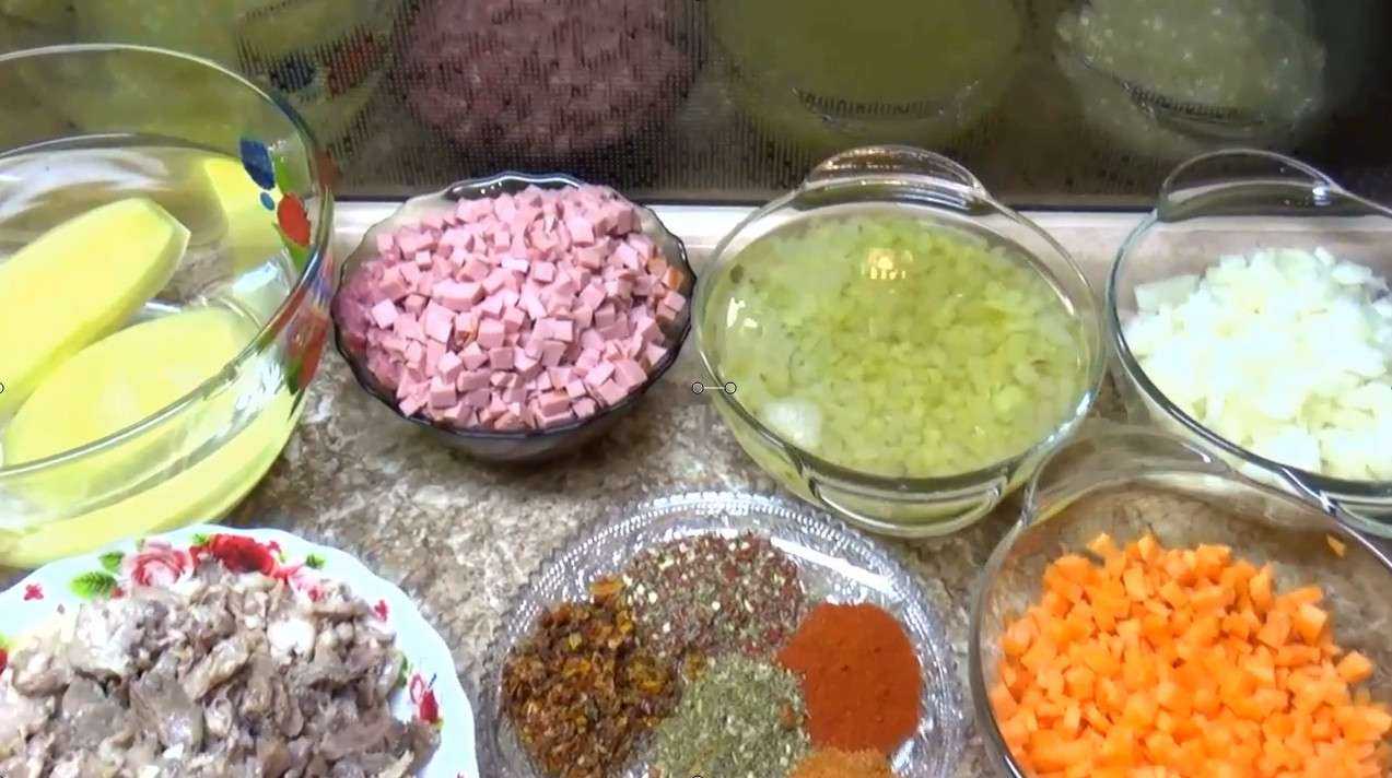 Для приготовления классического рассольника подготовьте картофель, нарезанное кубиками копчёное мясо, солёные огурцы, лук, морковь, специи.