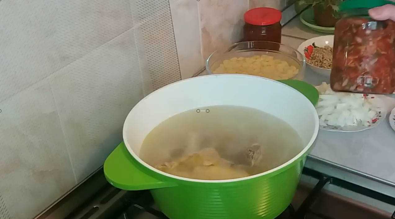 Заливаем 500 г мяса говядины 3 л воды и отвариваем в течение одного часа. Во время варки некоторое количество воды испарится, поэтому в готовый бульон долейте примерно 1 л воды. Готовое мясо отделяем от кости, делим кусочками и отправляем в кастрюлю. Также из этого мяса можем отдельно приготовить гарнир.