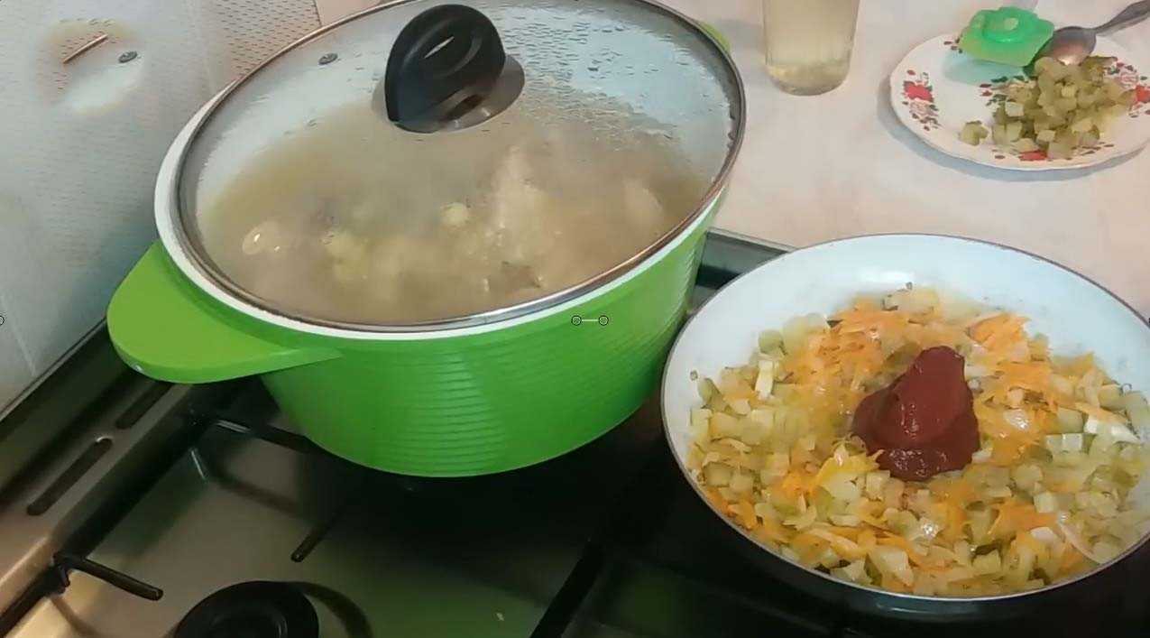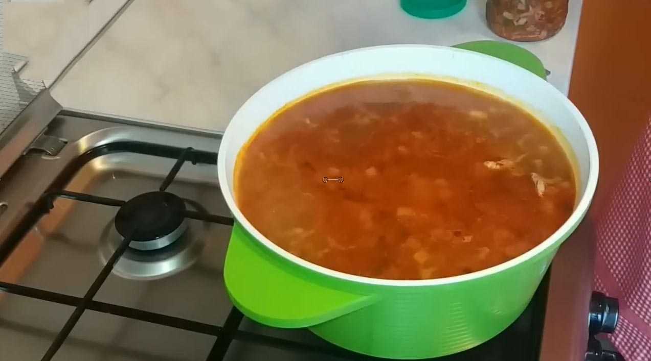 - Кастрюля закрывается крышкой, суп доводится до кипения, варится 5–7 минут, при необходимости добавляется огуречный рассол.