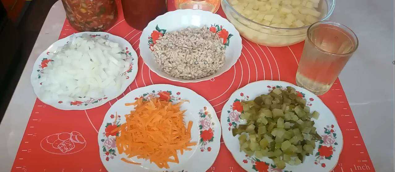 Затем морковь нужно натереть на крупной терке, а лук нарезать кубиками. Огурец и картофель следует мелко нарезать соломкой.