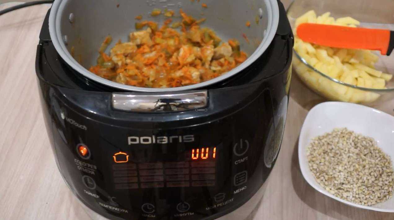 Следующим шагом нужно выключить режим жарка и добавить перловую крупу и картофель. Заливаем горячей кипяченой водой до уровня картофеля, добавляем соль и закрываем крышку мультиварки.