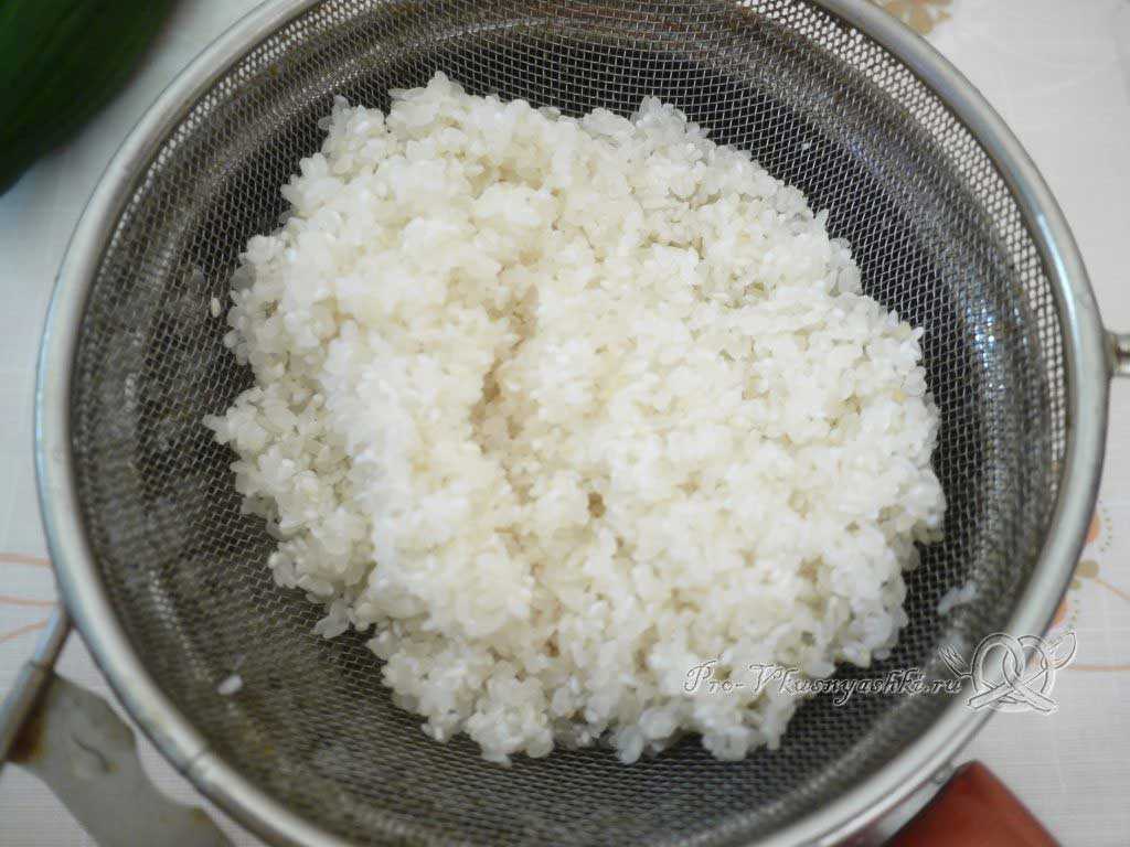 Затем приступают к приготовлению риса. Его промывают в холодной воде так долго, как потребуется, пока стекаемая вода не станет прозрачной. Рис отбрасывают на дуршлаг и выдерживают около часа.
