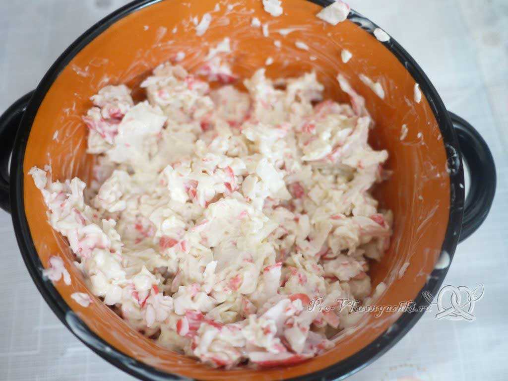 Начинку поливают майонезом, после чего в середину можно выложить немного икры.
