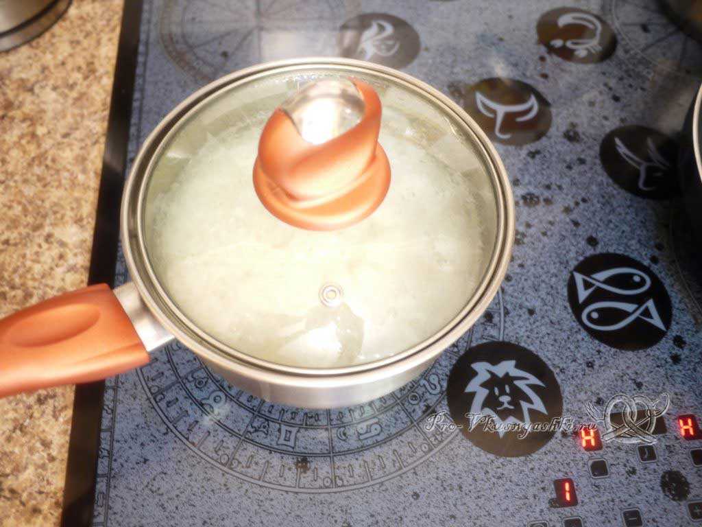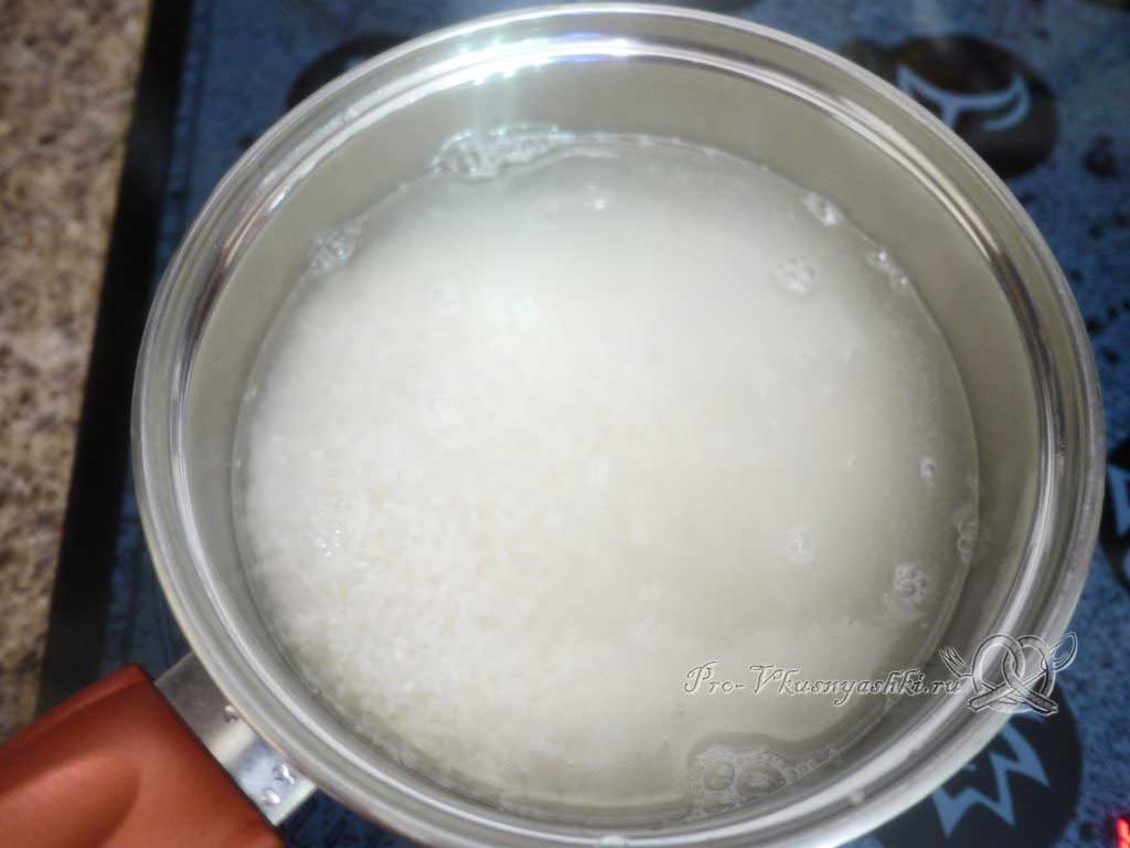 Рис должен быть круглозерного сорта. Его необходимо хорошо промыть от примесей, пыли и лишнего крахмала (лучше замочить на 10-15 мин). Варят крупу под плотно закрытой крышкой, затем настаивают, поместив под крышку полотенце