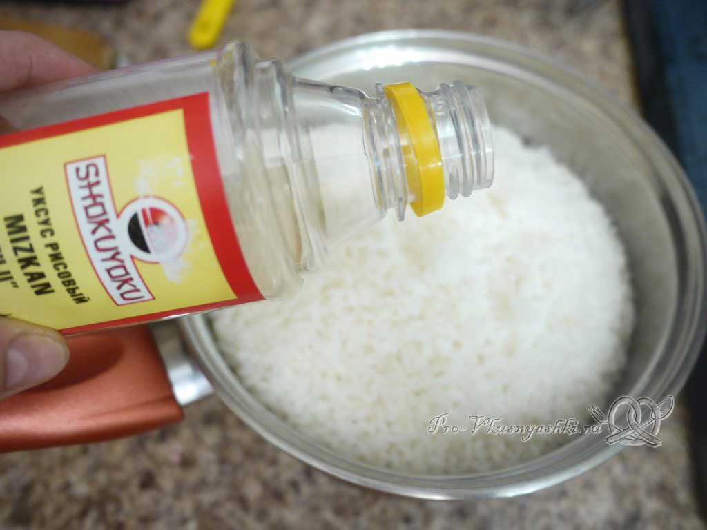 При покупке рисового уксуса обратите внимание на состав, чаще всего в него уже добавлены соль и сахар, тогда его сразу можно добавлять в отварной рис. Если сыпучих ингредиентов нет в составе, их нужно добавить (на 50 мл рисового уксуса, 30 г сахара, 10 г соли) и подогреть смесь до их растворения.