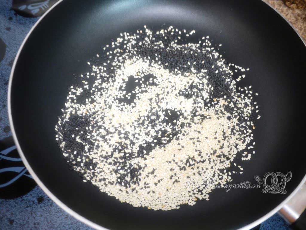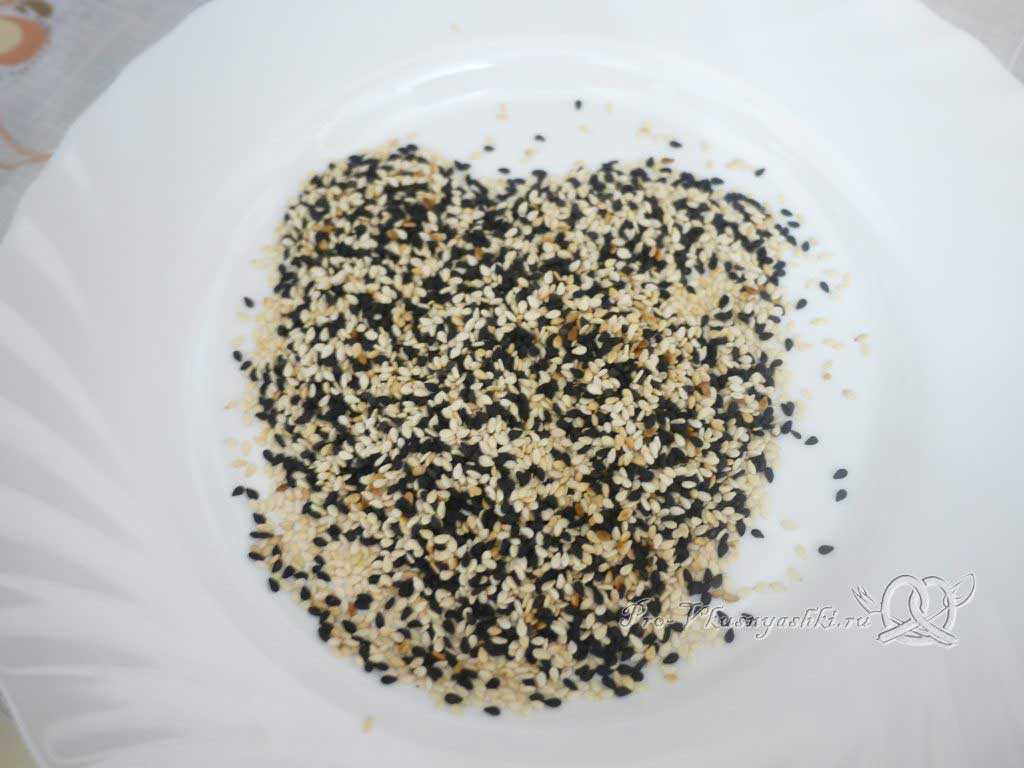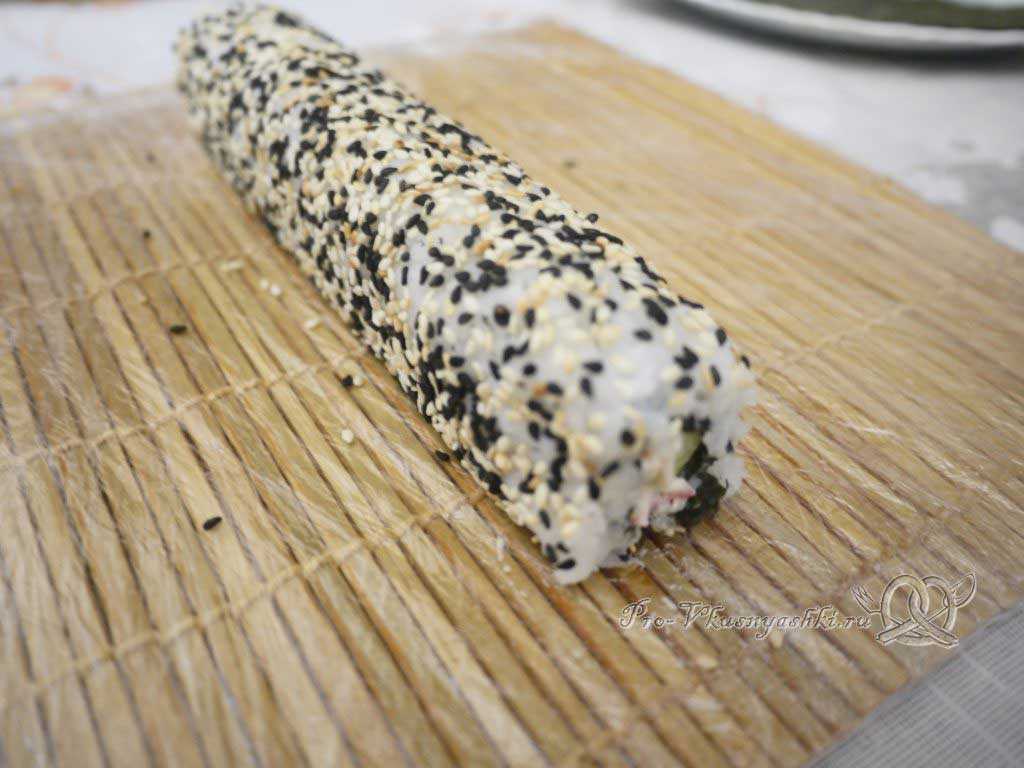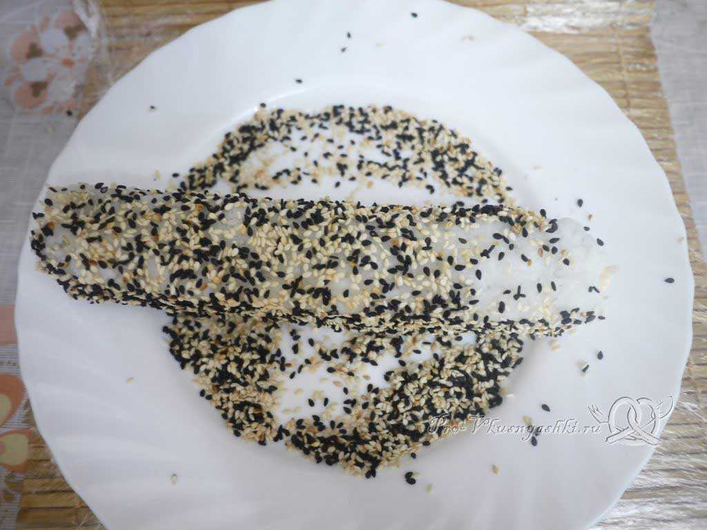 И осторожно, чтобы не повредить форму ролла, обваливаем его в кунжуте со всех сторон