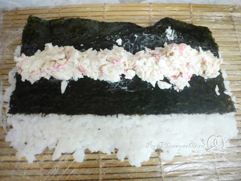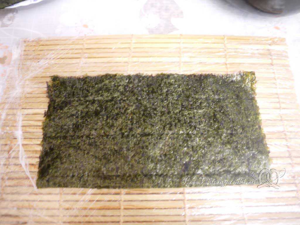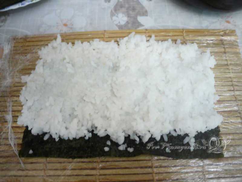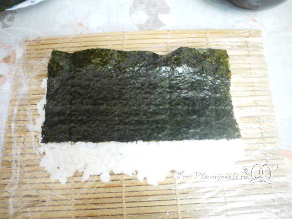 Циновку обворачивают пищевой пленкой и выкладывают половину одного листа водоросли нори. Верхний край листа смазывают водой, после чего можно выкладывать рис